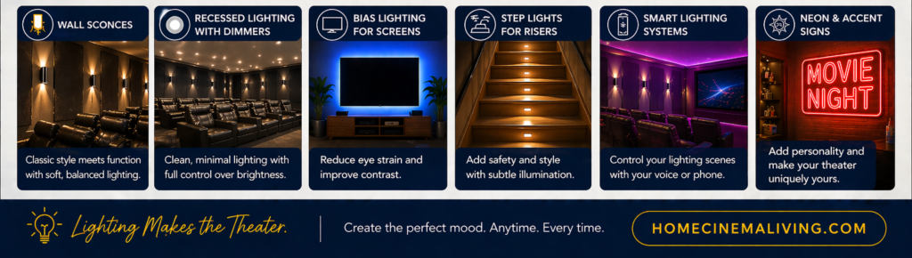 The best part about this lighting duo? They work together to shape a theater vibe that’s both chic and user-friendly. It’s all about layering different elements that not only look great individually but also enhance the overall ambience of your theater room.